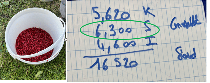 La première journée nous nous dirigeons à 45 minutes de la ferme, pour cueillir des groseilles. Je pose la main sur les tiges de groseilles, que je fais tomber directement dans le seau. À la fin du premier jour, bien que je n’ai pas vu le temps filer, nous pesons notre récolte et le résultat n’est pas fameux. J’ai commencé à avoir mal à l’épaule au bout de trois heures, ce qui a ralenti mon rythme et ma motivation. À la pesée, j’ai récolté le moins : 4,300kg quand la personne après moi a récolté 4,900kg.